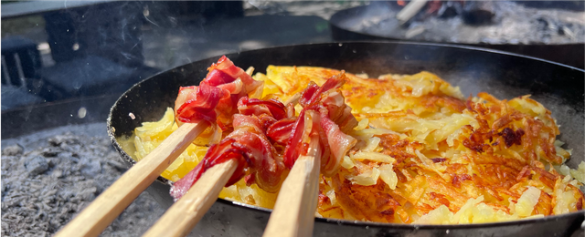 stell dir ein heisses zmorge am feuer in der noch kühlen morgenluft vor. es fehlt an nichts. die gipfeli werden durch die noch warme feuerkochte erdbeermarmelade gezogen, die berner-rösti aus der schweren eisenpfanne leuchtet goldgelb, der rösche speck tropft. und der feuerkaffee duftet durch die ganze füüri. den brunch kannst du mit deinen gästen sogar selbst auf dem feuer zubereiten, du wirst es nie vergessen!